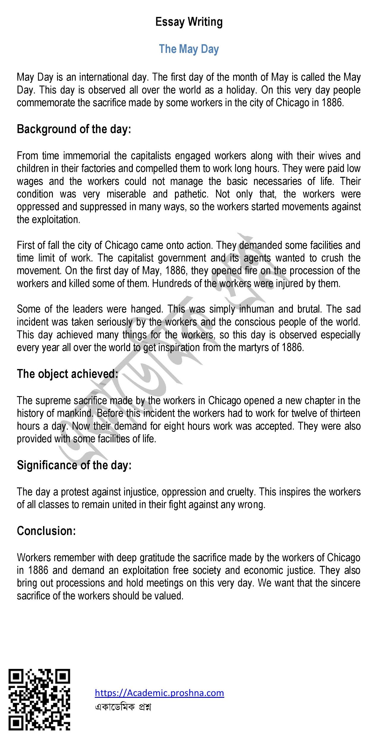 ছাত্র-ছাত্রী বন্ধুদের জন্য আমাদের এই ওয়েব সাইটটি। শিক্ষার্থীদের নিকট সহজে ও বিনামূল্যে মানসম্মত পাঠ্য বিষয়াবলী পৌছে দেওয়াই আমাদের প্রধান উদ্দেশ্য। শিক্ষার্থীরা যেন খুবই সহজে পাঠ্য বিষয়কে তার মোবাইল বা কম্পিউটারে সেভ করে রাখতে পারে ও পরবর্তীতে আবার পড়ার জন্য সংরক্ষন করতে পারে সে লক্ষে আজকের পাঠ্য “The May Day” কে একটি সাধারন ছবি হিসাবে প্রকাশ করা হল। Essay টি পড়তে ও সেভ করে রাখতে Read More বাটনে ক্লিক কর। Essay টি তে যে বিষয় গুলো শিক্ষার্থীদের নিকট দুর্বোধ্য মনে হতে পারে তার বাংলা অনুবাদ নিচে আলোচনা করা হলঃ